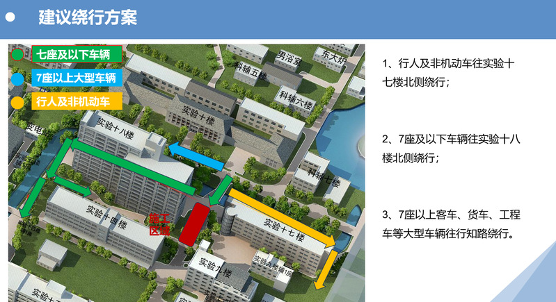 因徐汇校区实验十八楼东侧外墙维修,为保证工程顺利进行,减少施工中的安全风险。现根据施工需要,自2024年11月13日至2024年11月22日,每日13:30-15:30对实验十八楼东侧道路实施封闭,禁止一切行人、车辆通行,通行的行人、非机动车及机动车请按图指示进行绕行。